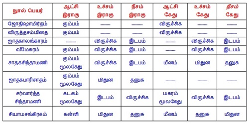 சாதகஅலங்காரம் குறிப்பிடும் சாயாக்கிரகங்களின் ஆட்சி உச்சச் சக்கரம் அட்டவணை (பக்கம். 350) கீழே: