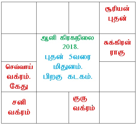 புதன் - 4 வரை திருவா - மிது. 5 -12 புனர; 11 ல் கடகம். 13 - 22 புசம், 23 - 29 - கடகம் ஆயில்யம்.