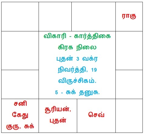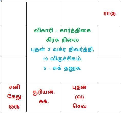 புதன் - 3 வக்ர நிவர்த்தி, 10 - 18 விசாகம் – துலா, 19 – 20 விசாகம், 21 அனுடம் – விருச்சிகம்.