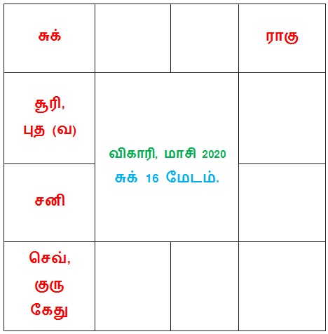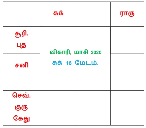 சூரியன் 1 – 6 அவிட்டம், 7 – 20 சதயம், 21 பூரட்டாதி – கும்பம்.