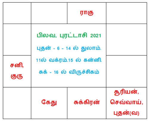 புதன் - 1 – 6, சித் கன்னி, 6 - 10 சித் துலாம். 11 வக்ரம். 15 சித் 2 கன்னி. 22 முதல் இம்மாத இறுதி வரை அஸ்தம்.