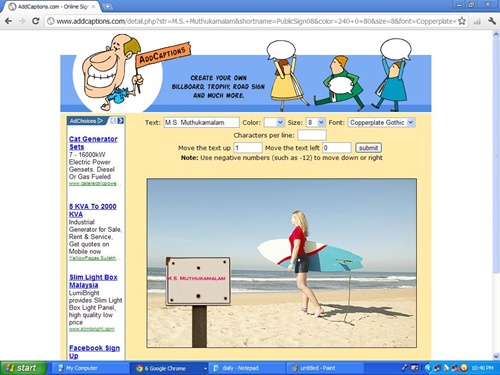 இந்த இணையதளத்தில் உங்கள் பெயரைப் பல்வேறு இடங்களில் சேர்த்துப் படமாக்கிப் பார்க்கலாம். இத்தளத்தில் மக்கள், பொது இடங்கள், வணிக அட்டைகள், வெற்றிக் கோப்பை மற்றும் இதர வகைகள் எனும் ஐந்து பிரிவுகள் இருக்கின்றன. இப்பிரிவுகளின் கீழ் பல்வேறு மாதிரிகள் கொடுக்கப்பட்டிருக்கின்றன. இவற்றில் ஏதாவது ஒன்றைத் தேர்வு செய்து சொடுக்கினால் தனியாக ஒரு பக்கம் திறக்கிறது. இதில் நாம் பெயர் அல்லது விரும்பும் சொற்களை உள்ளீடு செய்து கொண்டு, நிறம், அளவு, எழுத்துரு போன்ற தகவல்களைத் தேர்வு செய்து கீழுள்ள சமர்ப்பி எனும் பொத்தானைச் சொடுக்கினால் போதும்! நீங்கள் விரும்பிய மாதிரியில் உங்கள் பெயர் கிடைக்கும்.