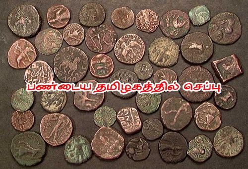 (வேங்கடசாமி 2011: 150). இலக்கியங்களில் காணம், கழஞ்சு, அஃகம், காசு போன்றவை பெரும்பாலும் பொன்னையே குறிப்பிடுகின்றன. இத்துடன் குறியீடுகள், சின்னங்கள், எழுத்துப் பொறிப்புக்கள் பற்றி எத்தகைய குறிப்பும் இல்லை. அவ்வகையில் முன்னரே குறிப்பிடப் பெற்றுள்ளதைப் போன்று தமிழகத்தில் கிடைக்கும் சங்ககால மன்னர்களது நாணயங்கள் செம்பினால் செய்யப் பெற்றனவாகவும் எழுத்துக்கள், சின்னங்கள் கொண்டனவாகவும் விளங்குவதால் இலக்கியச் சான்றிற்கும் தொல்லியல் சான்றிற்கும் இடையேயுள்ள முரண்பாடு தெளிவாகிறது. மேலும் சோழர்கால நாணயங்கள் பெரும்பாலும் செப்பால் ஆனவையே. அவ்வாறே கி.மு. 3 ஆம் நூற்றாண்டைச் செர்ந்த பாண்டியரின் செப்புக்காசு ஒன்றின் பின்புறத்தில், மீன் உருவம் கோட்ருவமாகவும் முன்புறத்தில் தமிழ்-பிராமி எமுத்துப்பொறிப்பும் வரையப்பட்டுள்ளது. மேலும் மற்றொரு கொல்லிப்புறை செப்புக்காசில் ரோமானிய உருவம் கொண்ட தமிழ்-பிராமி எமுத்துப்பொறிப்பு காணப்படுகிறது. எனின் இந்தியாவில் ரோமானிய மன்னர்கள் வெளியிட்ட காசுகளுக்கு அதிக கிராக்கி இருந்துள்ளது.