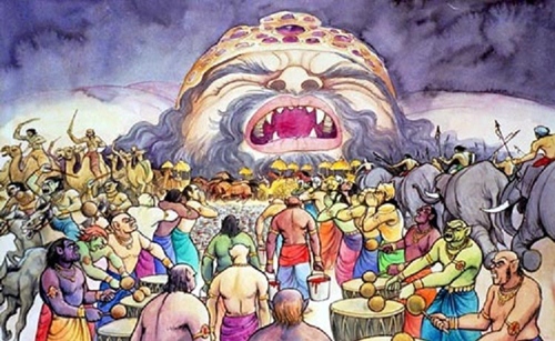 கும்பகர்ணனை உறக்கத்திலிருந்து எழுப்பினார்கள். யானை, குதிரை ஆகியவற்றை ஆயிரக்கணக்கில் அனுப்பி, அவனை மிதிக்கும் படி செய்து எழுப்ப முயற்சித்தனர். பல்வேறு முயற்சிகளுக்கெல்லாம் பின்னர், அரக்கர்கள் கும்பகர்ணனுடைய கன்னத்தில் உலக்கைக் கொண்டு தாக்க, இறந்தவன் உயிர்ப் பெற்று எழுந்தது போன்று, கும்பகர்ணன் எழுந்தான். (கும்பகர்ணன் வதைப் படலம் 1268)