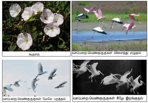 இங்கு கொடுக்கப்பட்டுள்ள படங்கள் புலவரின் வருணனையை ஓரளவு விளக்கும் வண்ணம் அமைந்துள்ளன. இவை வெவ்வேறு சூழ்நிலையில் எடுக்கப்பட்ட படங்களாயினும், விசைத்து எறியப்பட்ட ஒரு கூதள மாலையைப் போல் எழுந்து, பறந்து, பின்னர் அமரும் காட்சியை ஓரளவு விளக்கிக் காட்டுகின்றன.