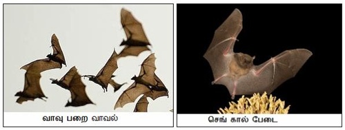 இங்கு, புலவர் வௌவாலை, சிறு பைந்தூவி செங்கால் பேடை என்கிறார். தூவி என்பது சிறகு. வௌவாலின் சிறகுகள் பச்சையாகவா இருக்கின்றன? பச்சைக் குழந்தை, பச்சை மேனி என்கிறாற்போல் இதற்கு tender என்று பொருள். அதனால்தான் உரைகாரர்கள் மென்சிறகு என்கிறார்கள். சரி, இது சிறியதாகவா இருக்கிறது? சொல்லப்போனால் இது பெருஞ்சிறகுப் பறவை இனத்தைச் சேர்ந்தது. எனவேதான் இது பறப்பதை வாப்பறை என்கிறோம். அப்படியானால், இதனைச் சிறு தூவி என்பதன் காரணம் என்ன? சிந்தித்துப் பாருங்கள்! இதன் சிறகுகளைப் பற்றிக் கூறும் ஒரு பறவை ஆய்வாளர் கூறுகிறார், “The fur is very fine and silky”. இதைத்தான் புலவர் சிறு(fine) பைந்(silky)தூவி என அழகுதமிழில் குறிப்பிடுகிறார். மீண்டும் எத்துணை பொருத்தமான சொல்லாட்சி என்று கவனியுங்கள். புலவர் தாம் குறிப்பிடும் வௌவாலைப் பேடை என்கிறார். கோழி, குருவி, மயில் போன்ற பறவை இனங்களில் ஆண், பெண் வேறுபாடு காண்பது எளிது. ஆனால் வௌவாலில், அதுவும் உயரே பறக்கும் போது, அதனை ஆண், பெண் என்று காண்பது எளிதா? நம்பும்படியாக இல்லையே எனலாம். மீண்டும் பறவை ஆய்வாளர்கள் என்ன சொல்கிறார்கள் பார்ப்போம். “ Females have one pair of mammae located in the chest region.” அதாவது பெண் வௌவால்களுக்கு மனித இனத்தைப்போலவே மார்பகங்கள் உண்டு. எனவே, உயரே பறந்தாலும் கீழிருந்து பார்த்து இனம் காணுவது எளிதானதே. இரவில்தானே அவை வெளிவரும், எப்படி இனம் காணுவது என்கிறீர்களா? புலவர் பகலில் பறக்கும் வௌவால் பேடையைப் பற்றித்தானே குறிப்பிடுகிறார்! பகலில் வௌவால்கள் பழந்தின்னப் போகுமா? நியாயமான கேள்வி! பறவை ஆய்வாளர் என்ன சொல்கிறார் என்று மீண்டும் கேட்போம்: “The camp is the base from which they make their night time foraging trips. Then they prefer nectar and pollen of native trees and rainforest fruits. Daytime is surprisingly busy for these animals that we usually think of as creatures of the night. You will see them fanning their wings to keep cool when it is hot, grooming, giving birth, tending young, mating, looking around, even flying around: all during daytime. However they will not be eating”. பகலில் அவை இரை தேடமாட்டா என்ற செய்தி சற்று அதிர்ச்சி அளிக்கிறது. மேலும், அவை கூட்டமாகத்தான் இரைதேடிப் போகும் எனவும் காண்கிறோம். தொடர்ந்து பறவை ஆய்வாளரின் கூற்றைப் படிக்கையில்தான் தெளிவு பிறந்தது. “Only once, when there was a terrible food shortage, have I seen a flying fox eating leaves during the daytime in the camp.”