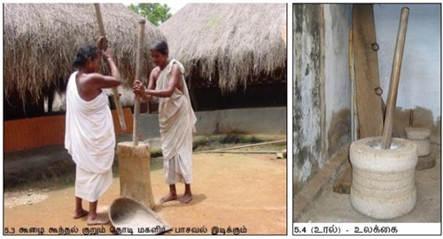 கூந்தல் என்பது பெண்களின் தலைமயிர். கூழை என்பது குட்டையான எனப் பொருள் தரும். வேலைக்காரப் பெண்களுக்குத் தங்கள் தலைமயிரைப் பேணிக்கொள்ள நேரம் இருக்காது. சும்மா அள்ளி முடிந்துகொண்டு வருவார்கள். சரியாகப் பேணப்படாத தலைமயிர் குட்டையாகத்தானே இருக்கும். எனவேதான் உலக்கை இடிப்போரின் கூந்தலை கூழைக்கூந்தல் என்கிறார் புலவர். தொடி என்பது வளையல். வேலைக்காரப் பெண்கள் பெரிய வளையல்கள் அணிந்திருந்தால் வேலைசெய்யும்போது வளையல்கள் முன்னும் பின்னும் நகர்ந்து இடைஞ்சலாக இருக்கும்தானே! எனவே, அவர்கள் கையை இறுகப் பிடிக்கும் வண்ணம் சிறிய வளையல் அணிந்திருக்கிறார்கள் - மொட்டைக்கையாய் இருக்கவேண்டாம் என்பதற்காக. குறும் என்பது குறுகிய அல்லது சிறிய எண்ணிக்கையிலான என்ற பொருள்தரும். உலக்கையை நன்றாக வயிரம்பாய்ந்த மரத்திலிருந்து செய்வார்கள். காழ் என்பது மரவயிரம் - அதாவது நன்றாக விளைந்து முற்றிய மரத்தின் பகுதி. உலக்கை மரத்தால் ஆனதால், அதன் தலையில் ஓர் இரும்புப் பட்டை அடித்திருப்பார்கள். அதனையும் காழ் எனலாம். (படத்தைப் பாருங்கள்) அவல் இடிப்பதைக்கூட புலவர் எத்துணை உன்னிப்பாகக் கவனித்து, ஒன்றுவிடாமல் வருணிக்கிறார் பாருங்கள்!