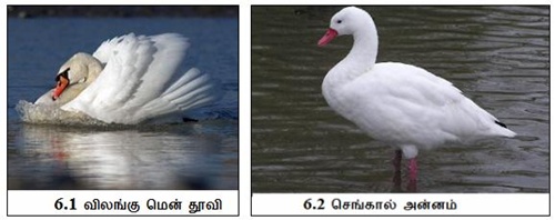 விலங்குமென் தூவிச் செங்கால் அன்னம் என்ற வருணனையைப் பாருங்கள்! புலவர் கற்பனையாக இதைச் சொல்லவில்லை - நேரில் கண்டே இவ்வாறு கூறுகிறார் என்பது தெளிவாகிறதல்லவா! விலங்குதல் என்றால் விலகி இருத்தல். பெரும்பாலான பறவைகளைப் போலன்றி, அன்னத்தின் சிறகில் இறகுகள் அடுக்கடுக்காய் இருப்பதைப் படத்தில் காணுங்கள். மேலடுக்கில் இருப்பவைதான் தூவி எனப்படும் மெல்லிய இறகு. மன்னர்களுக்கு படுக்கை மெத்தை செய்யப் பயன்படும் என்று நெடுநல்வாடை கூறுகிறது.