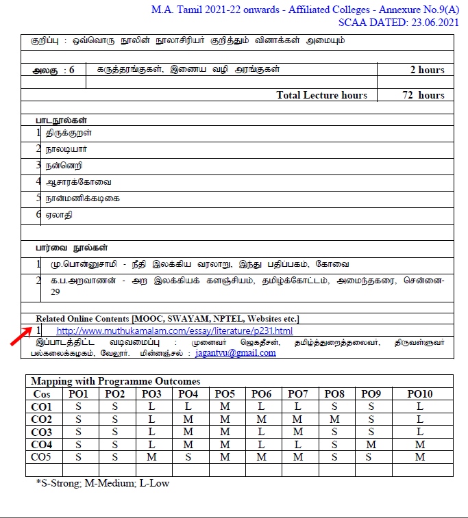 கோயம்புத்தூர், பாரதியார் பல்கலைக்கழகத்துடன் இணைப்பு செய்யப்பட்டிருக்கும் கல்லூரிகளுக்கான எம்.ஏ. (தமிழ்) பாடத்திட்டம் (Program Code:31A, 2021-2022 onwards), குறியீட்டு எண்: 20TAM23A, முதன்மைப்பாடம் 5 அற இலக்கியம் பாடத்தில் ‘Related Online Contents [MOOC, SWAYAM, NPTEL, Websites etc.] -ல், முத்துக்கமலம் பன்னாட்டுத் தமிழ் மின்னிதழ் இதழில் இடம் பெற்ற, விருதுநகர், வே.வ. வன்னியப்பெருமாள் பெண்கள் கல்லூரி, (தன்னாட்சி), தமிழ்த்துறை, உதவிப்பேராசிரியர், முனைவர் பா. கனிமொழி அவர்களது “மானுட நன்மைக்கு வழிகாட்டிய அற இலக்கியங்களின் பங்களிப்பு” எனும் கட்டுரைக்கான இணைய முகவரி: http://www.muthukamalam.com/essay/literature/p231.html கொடுக்கப்பட்டிருக்கிறது.