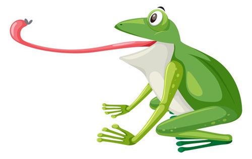 தவளைகளில் 4000 வகையான தவளைகள் உள்ளன. தவளையின் நாக்கு, மனிதர்களின் நாக்குகளை விடப் பத்து மடங்கு மெலியது. தவளையின் நாக்கை, இழுபடக்கூடிய செயற்கை இழைக்கான மரக் குழைம (Viscose Elastic) நாக்கு என்பர். தவளையின் நாக்கு பொதுவாக சிவப்பு நிறத்தில் இருக்கும். சில வகை தவளைகளின் நாக்குகள் இளஞ்சிவப்பு, மஞ்சள், நீல நிறங்களில் காணப்படும். தவளையின் உமிழ்நீரை, நியூட்டன் வகையில்லாப் பாய்மம் (Non -Newtonian Fluid) என்பர். தவளை தன் இரையை 0.07 நொடிகளுக்குள் சுருட்டி விழுங்கி விடும். மனிதன் கண்ணிமைக்கும் நேரத்தில் ஐந்தில் ஒரு பங்கு நேரத்தில் இரையை விழுங்கி விடும். மொத்தத்தில் தவளையின் நாக்கு ஒரு தூண்டில் போலச் செயல்படுகிறது.