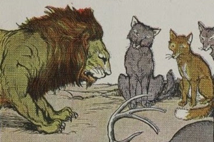 அடுத்த நிமிடம் சிங்கத்தின் பார்வை ஓநாய் மீது படிந்தது. கோள் மூட்டிய ஓநாய் பலியிடப்பட்டது. அதன் தோலைச் சிங்கம் போர்த்திக் கொண்டது.