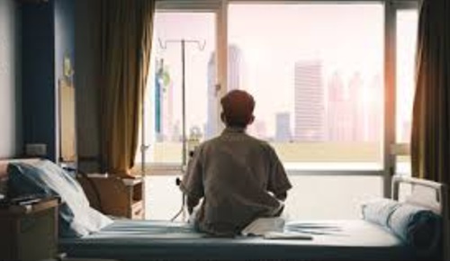 ஒரு மருத்துவமனை. அதன் ஓர் அறையில் இரண்டு நோயாளிகளின் கட்டில்கள்.