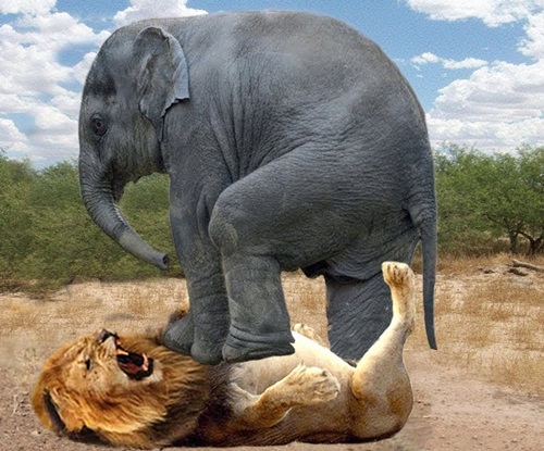 யானை கோபத்துடன் தன் துதிக்கையால் சிங்கத்தைச் சுற்றி வளைத்துத் தூக்கி வீசியது.