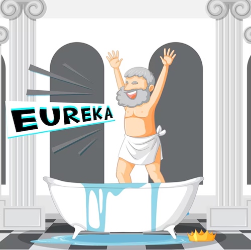 ஆர்க்கிமிடிஸ் தொட்டியிலிருந்து வெளியே குதித்தார். ‘யுரேகா! யுரேகா! (நான் கண்டுபிடித்துவிட்டேன்! நான் கண்டுபிடித்துவிட்டேன்!)’ என்று கூவியபடியே குளித்துக் கொண்டிருந்த ஈர உடலோடு அரண்மனை நோக்கி ஓடினார்.