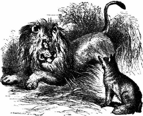 சிங்கம் அதன் வலிமையைப் பற்றி மிக அதிகமாகப் பெருமை பேச ஆரம்பித்தது. நரி அதன் இயல்பான பசப்பும் பாசாங்குமாகச் சிங்கத்தின் தற்புகழ்ச்சிக்கு ஒத்துப் பாடியது. சிங்கம் அளவுக்கு மேல் பீற்றிக் கொண்ட போது நரி, “ இங்கே பாருங்கள் அரசே, உங்களைவிட வலிமையான மனித மிருகத்தை உங்களுக்குக் காட்டுகிறேன்!” என்றது.