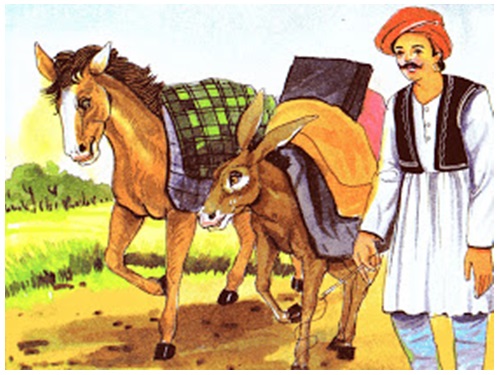 ஒரு வியாபாரி தனது வீட்டில் குதிரையும், கழுதையும் வைத்திருந்தான். வியாபாரத்திற்காக தனது பொருட்களைக் கழுதையின் முதுகு மீது கட்டுவான். குதிரை மீது தான் அமர்ந்தவாறு கழுதையினை இழுத்துச் செல்வான். பொருட்கள் எடுத்து செல்லும் எல்லா ஊரிலும் வியாபாரியின் பொருட்கள் நன்றாக விற்பனையானது. அந்த வியாபாரிக்கு நல்ல லாபம் கிடைத்தது. அதனால், வழக்கத்திற்கு மாறாக விற்பனைக்கு அதிகப் பொருட்கள் எடுத்துச் செல்லலாம் என்று தீர்மானித்தான்.