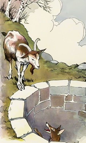 நல்ல சமயத்தை எதிர்ப்பார்த்திருந்த நரி, அந்த ஆட்டின் கொம்புகளைப் பிடித்து, அதன் மீது ஏறி வெளியேக் குதித்து தப்பி ஓடியது.