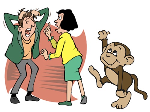 வீட்டுக்குத் திரும்பிய கணவன், குரங்கைப் பார்த்துக் கோபமடைந்தான்.