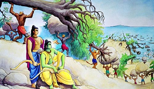 பகவான் ராமச்சந்திர மூர்த்தி இலங்கை செல்ல சுக்ரீவன் தலைமையில், வானரப் படைகளின் உதவியோடு கடலில் பாலம் அமைக்கிறார்.