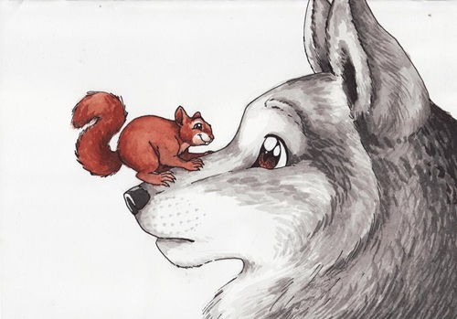 ஒரு மரத்தில் அணில் ஒன்று தாவி விளையாடிக் கொண்டிருக்கும்போது தவறிக் கீழே நின்ற ஒநாயின் மீது விழுந்தது.