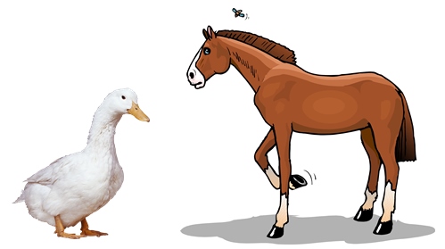 வாத்து ஒன்று குதிரையைப் பார்த்து சொன்னது,''நான் எல்லா வகையிலும் உன்னைக் காட்டிலும் சிறப்புடையவன். உன்னைப்போல தரையில் என்னால் நடக்க முடியும். எனக்கு அழகான இறக்கைகள் இருக்கன்றன. அது கொண்டு வானில் என்னால் பார்க்க முடியும். என்னால் ஆற்றில் நீந்திக் குளிக்க முடியும். என்னிடம் ஒரு பறவை, ஒரு மீன், ஒரு மிருகம் இவற்றின் செயல்பாடுகள் அனைத்தும் உள்ளன''