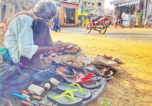 ஒரு புத்தகத்தைப் பார்ப்பது போல் அவன் கைகள் செருப்புத் தைத்துக் கொண்டிருந்தன.