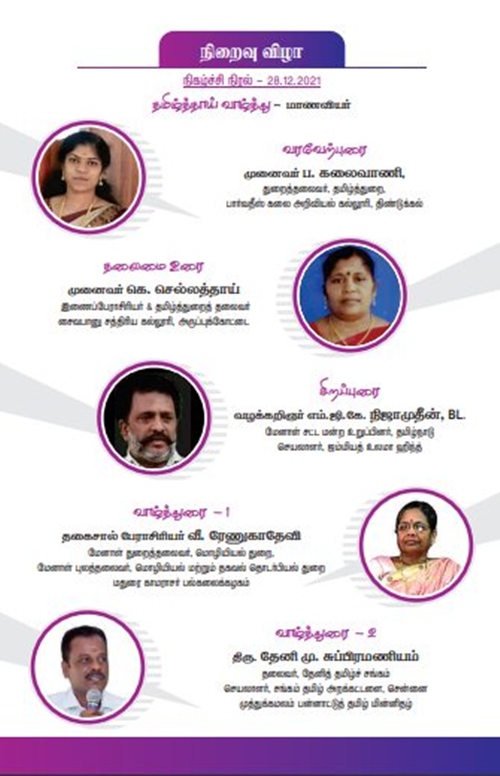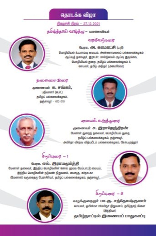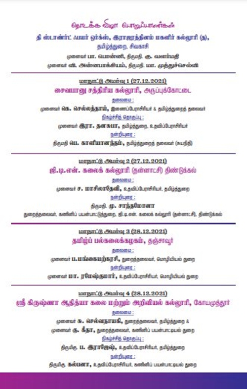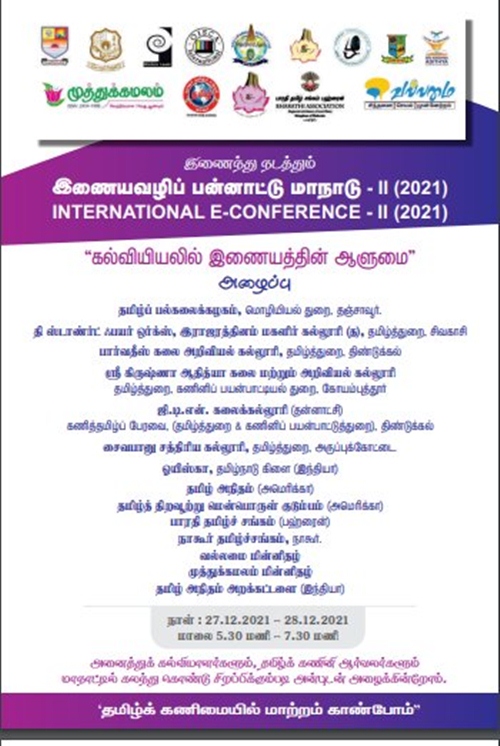 முத்துக்கமலம் பன்னாட்டுத் தமிழ் மின்னிதழ், தஞ்சாவூர் தமிழ்ப் பல்கலைக்கழக மொழியியல் துறை, தி ஸ்டாண்டர்டு பயர் ஒர்க்ஸ் இராஜரத்தினம் மகளிர் கல்லூரி (தன்னாட்சி), திண்டுக்கல் பார்வதீஸ் கலை அறிவியல் கல்லூரி, சிவகாசி, திண்டுக்கல் ஜி.டி.என் கலைக்கல்லூரி (தன்னாட்சி), கோயம்புத்தூர் ஸ்ரீ கிருஷ்ணா ஆதித்யா கலை மற்றும் அறிவியல் கல்லூரி, அருப்புக்கோட்டை சைவபானு சத்திரிய கல்லூரி, ஒயிஸ்கா சர்வதேச நிறுவனம் (ஜப்பான்) தமிழ்நாடு கிளை, தமிழ் அநிதம் (அமெரிக்கா), தமிழ்திறவூற்று மென்பொருள் குடும்பம் (அமெரிக்கா), பக்ரைன் பாரதி தமிழ்ச் சங்கம், நாகூர் தமிழ்ச் சங்கம், வல்லமை மின்னிதழ், தமிழ் அநிதம் அறக்கட்டளை (இந்தியா) ஆகிய அமைப்புகளுடன் ஒன்றிணைந்து 27-12-2021 மற்றும் 28-12-2021 ஆகிய இரு நாட்கள் ‘கல்வியியலில் இணையத்தின் ஆளுமை’எனும் பொருண்மையில் எனும் “இரண்டாவது பன்னாட்டுக் கல்வியியல் மாநாடு – 2021” ஒன்றினை இணைய வழியிலான பன்னாட்டு மாநாடு ஒன்றினை நடத்தியிருக்கிறது.